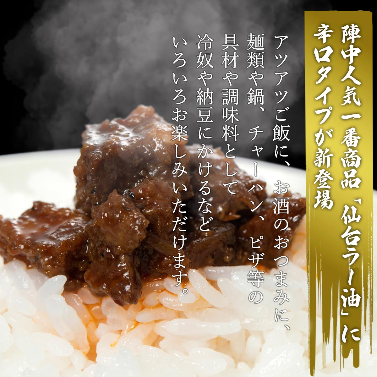 陣中人気NO.1商品「仙台ラ-油」に辛口タイプが新登場小さくカットした牛タンと、薬味(赤トウガラシ、玉ねぎ、生姜、にんにく、赤糖、昆布、牛タンエキス等)を大鍋でじっくり甘辛く煮込み、自社で調合したオリジナル四川風調味油(ゴマ油ベ-スの食油、唐辛子、にんにく、牛タンエキス)と丁寧に合わせました。