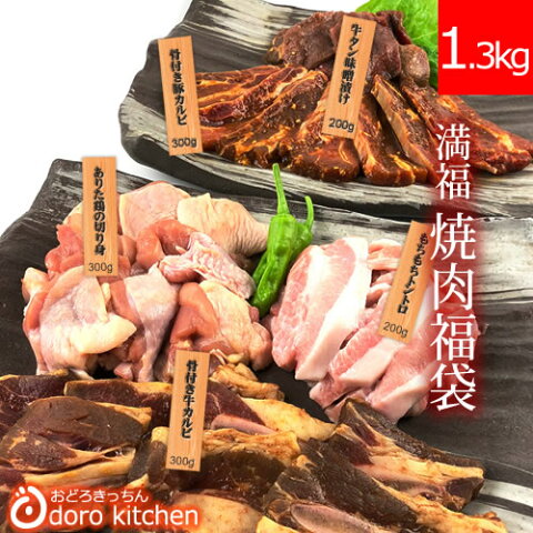 【満福焼肉福袋(1.3kg)】 お取り寄せグルメ 骨付き牛カルビ 骨付き豚カルビ 牛タン味噌漬け もちもち豚トロ ありた鶏の切り身[ 大容量 大盛り 大人数 ギフト キャンプ バーベキュー 焼肉セット] バレンタイン ギフト