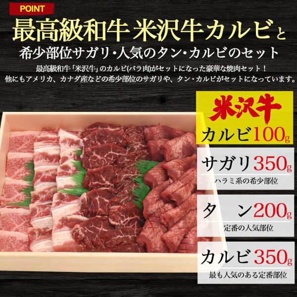 米沢牛カルビ入り! 3種バーベキュー・焼肉セット 合計1kg(約5〜7人用) 最高級和牛「米沢牛」のカルビ(バラ肉)がセットになった豪華な焼肉セット! 他にもアメリカ、カナダ産の希少部位のサガリや、人気のタン・カルビがセットになっています。