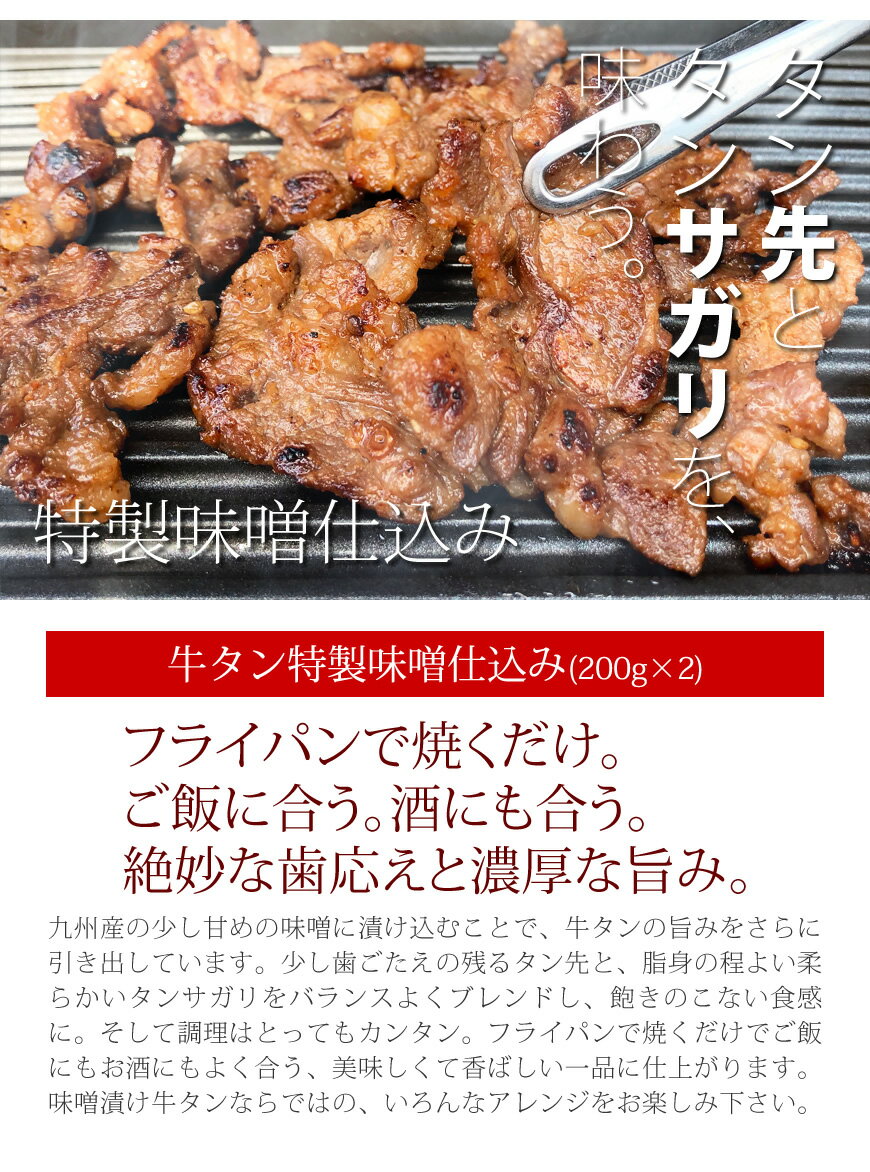 商品詳細情報 商品名 牛タン特製味噌仕込み[200g×2] 内容量 牛タン特製味噌仕込み 200g×2 賞味期限 発送より30日間保証(商品に記載) 原材料表示 原材料、アレルギー表示、保存方法、販売者はこちらの一覧ページをご覧下さい。