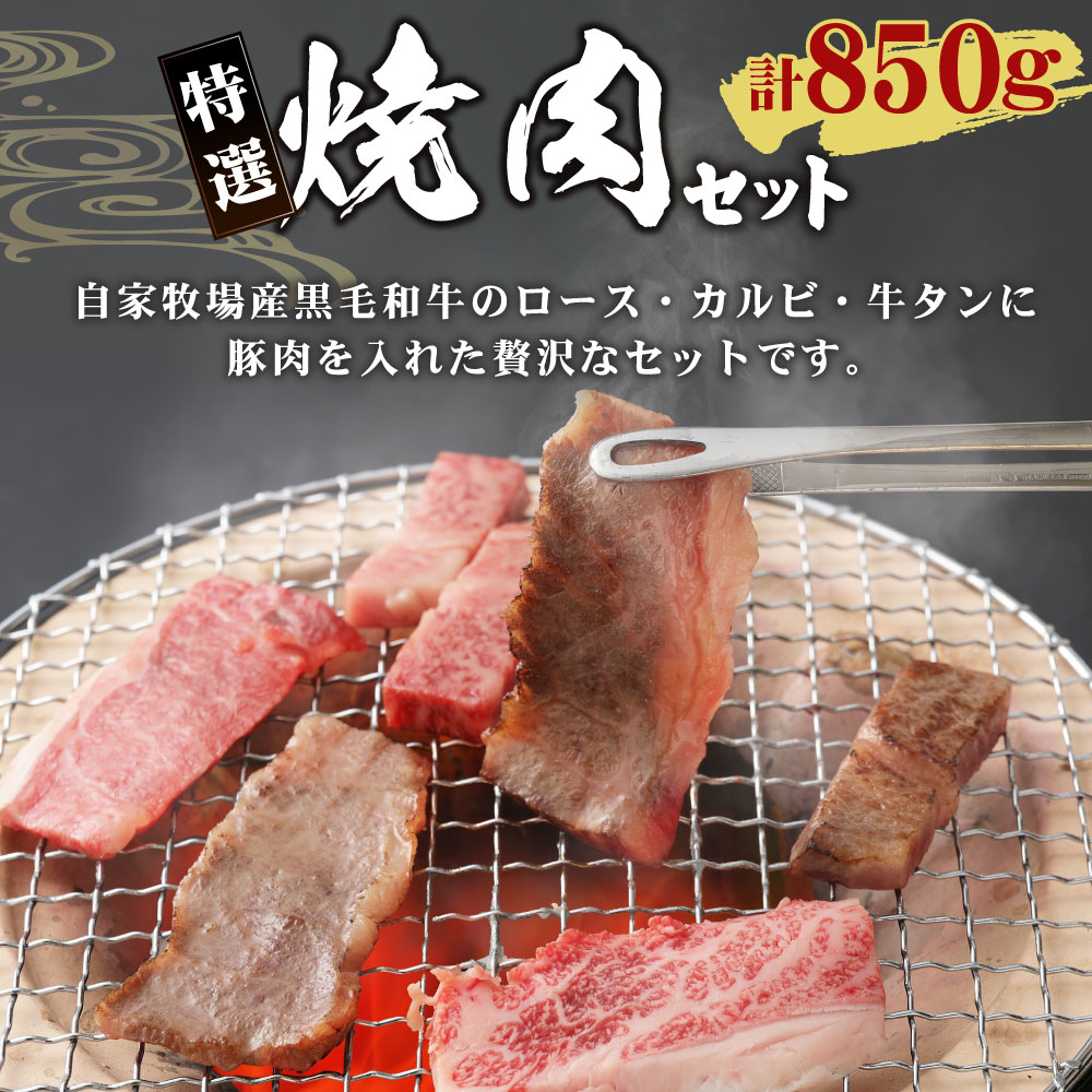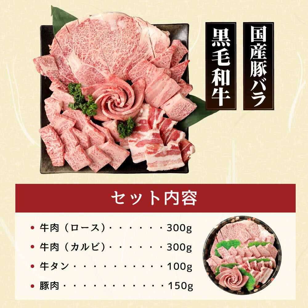 商品説明 名称 特選焼肉セット 産地 熊本県産(自家牧場) 内容量 牛肉 ロース:300g 牛肉 カルビ:300g 牛タン:100g 豚肉:150g 原材料名 黒毛和牛 国産豚バラ 賞味期限 60日 保存方法 冷凍 提供者 肉のたかむく 商品説明 自家牧場産黒毛和牛のロースとカルビと牛タンに豚肉を入れたセットです。